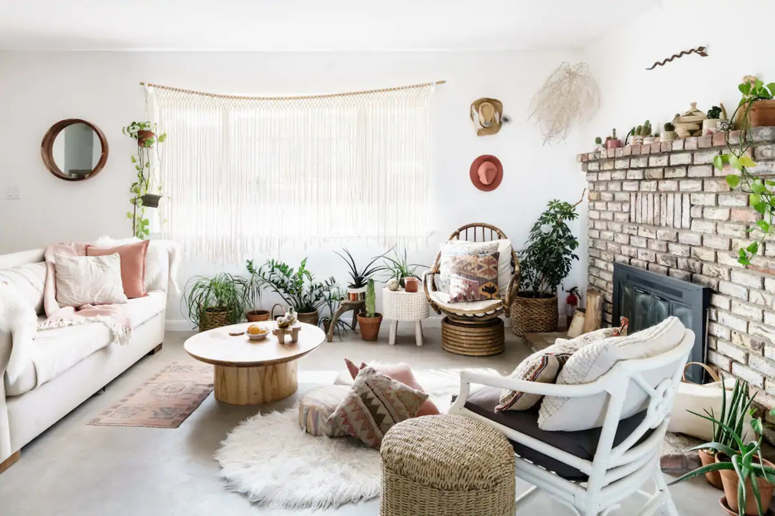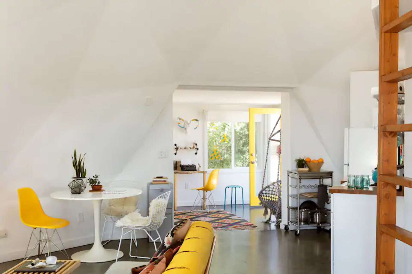 We’re obsessed with the giant, rustic porch swing that Casa Joshua Tree has on deck. Sunsets in the desert are notoriously beautiful, so it’s easy to picture ourselves here, cold drink in hand, soaking in the last golden rays of light as clusters of stars gradually take over the sky. Nice. Also in store: bright, airy rooms full of plants and a cozy fireplace. If you consider yourself a true patron of the arts, this is a great place to support: This little Airbnb is run by an artist, painter Lindsay Hollinger, and offers an artist residency program.