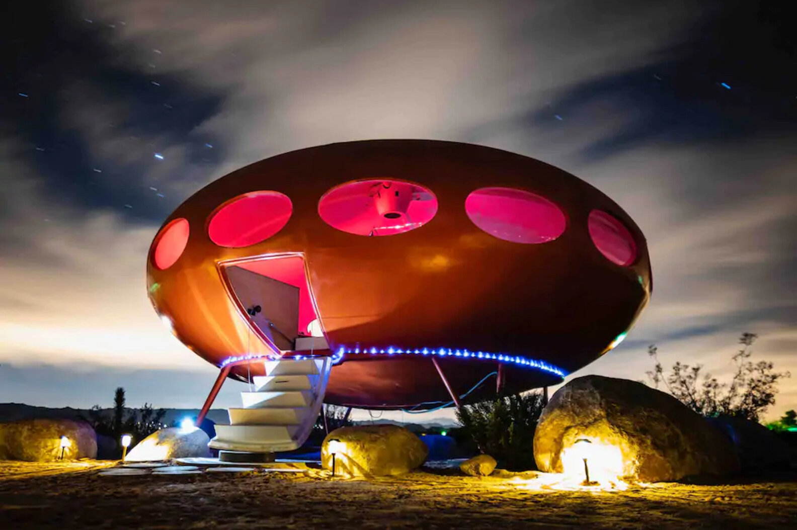 If you haven’t heard, Joshua Tree is chock full of weird and wonderful things. This is one of them: a 13-foot tall UFO-shaped abode, one of just 65 known Futuro houses worldwide and the only one you can rent in the U.S. Once beloved by Hugh Hefner (yes, really), the spaceship comes equipped with outdoor showers, restrooms, and a kitchen for cooking under the stars. But perhaps the best thing about this is the reasonable $211/night price tag. Who says you need Elon Musk-level money to go to space?